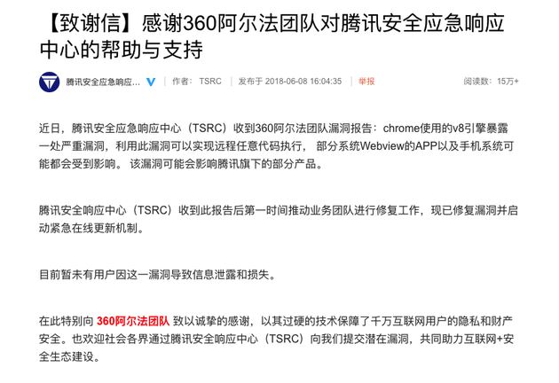 騰訊方面在致謝信中稱,近日,騰訊安全應急響應中心(TSRC)收到 360 阿爾法團隊漏洞報告:chrome使用的v8 引擎暴露一處嚴重漏洞,利用此漏洞可以實現遠程任意代碼執行, 部分系統Webview的APP以及手機系統可能都會受到影響。 該漏洞可能會影響騰訊旗下的部分產品。騰訊安全響應中心收到此報告后第一時間推動業務團隊進行修復工作,現已修復漏洞并啟動緊急在線更新機制。目前暫未有用戶因這一漏洞導致信息泄露和損失。