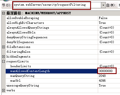第一處在,選擇左側(cè)的站點(diǎn),然后找到后側(cè)的管理——配置編輯器打開,找到(圖-2)的位置,可以看到默認(rèn)30000000的限制(30M),修改成需要的大小即可